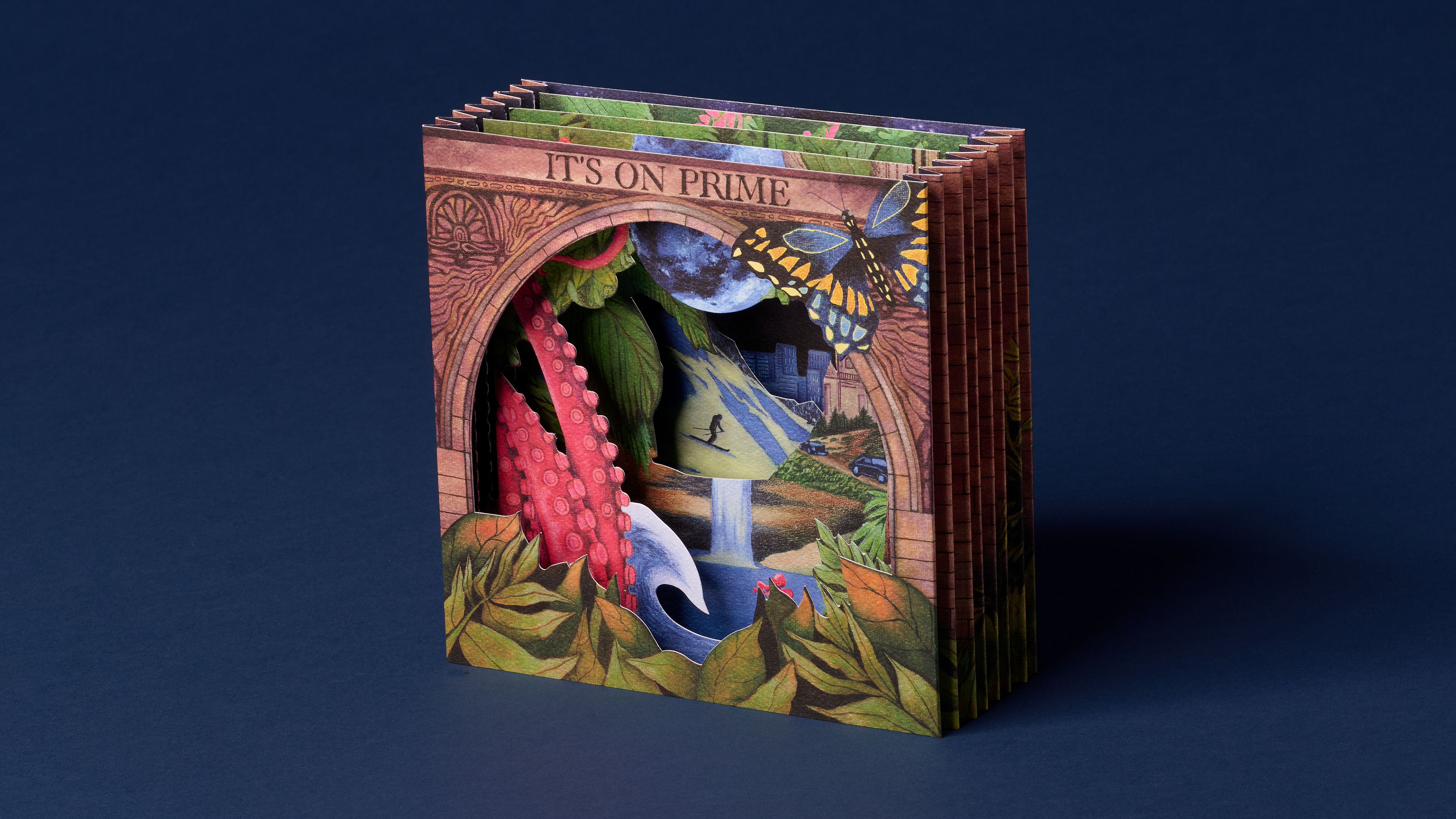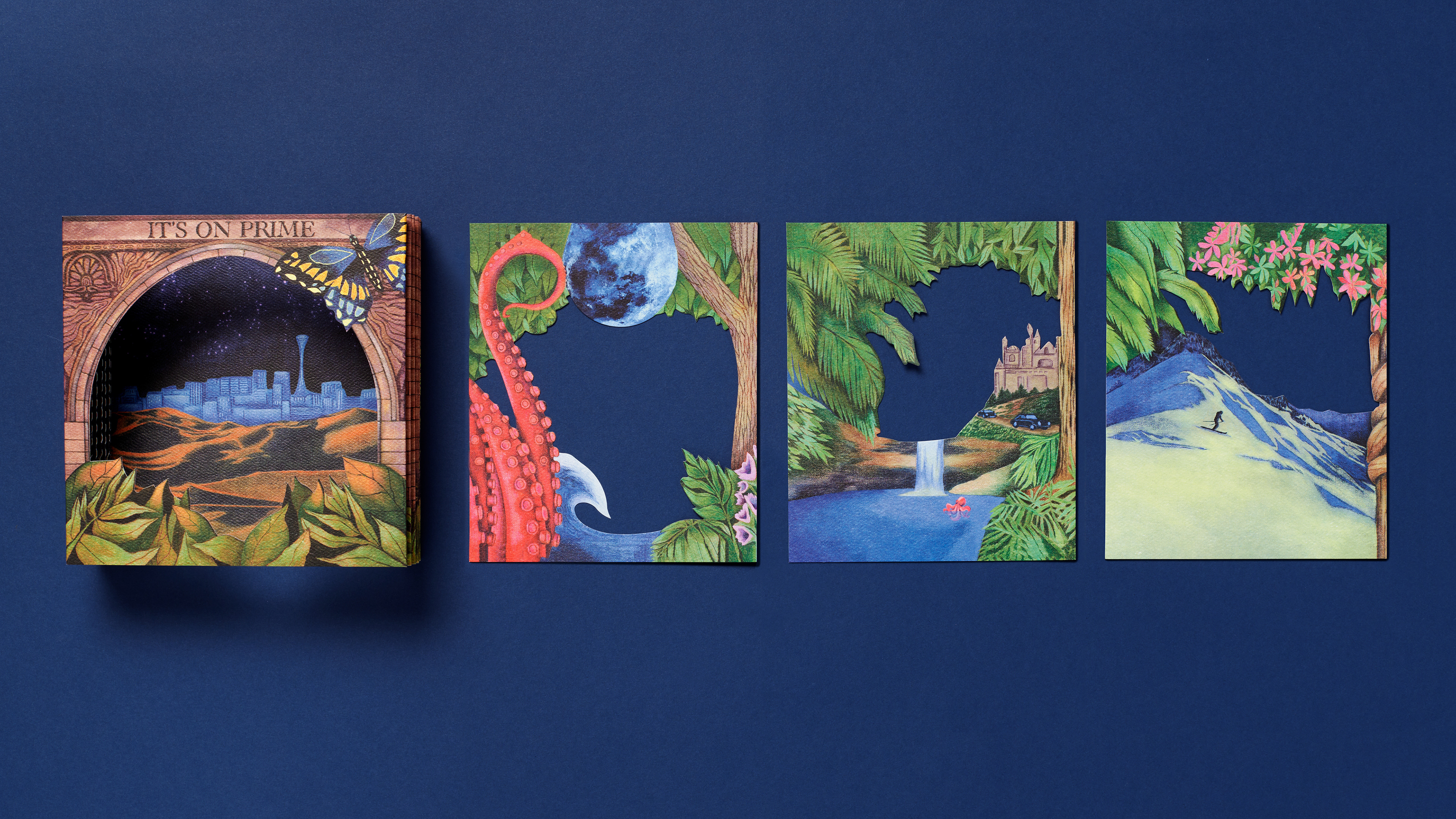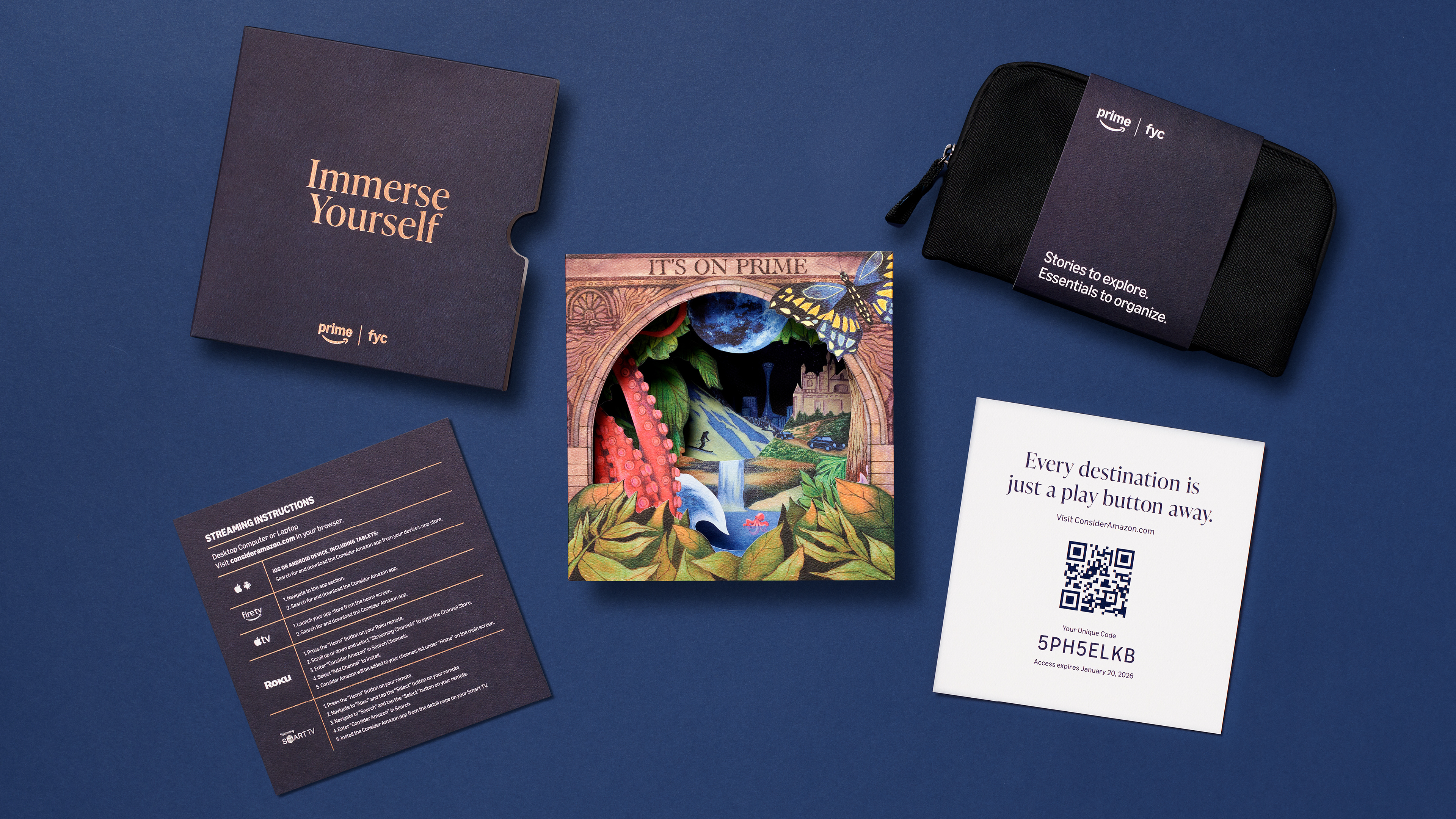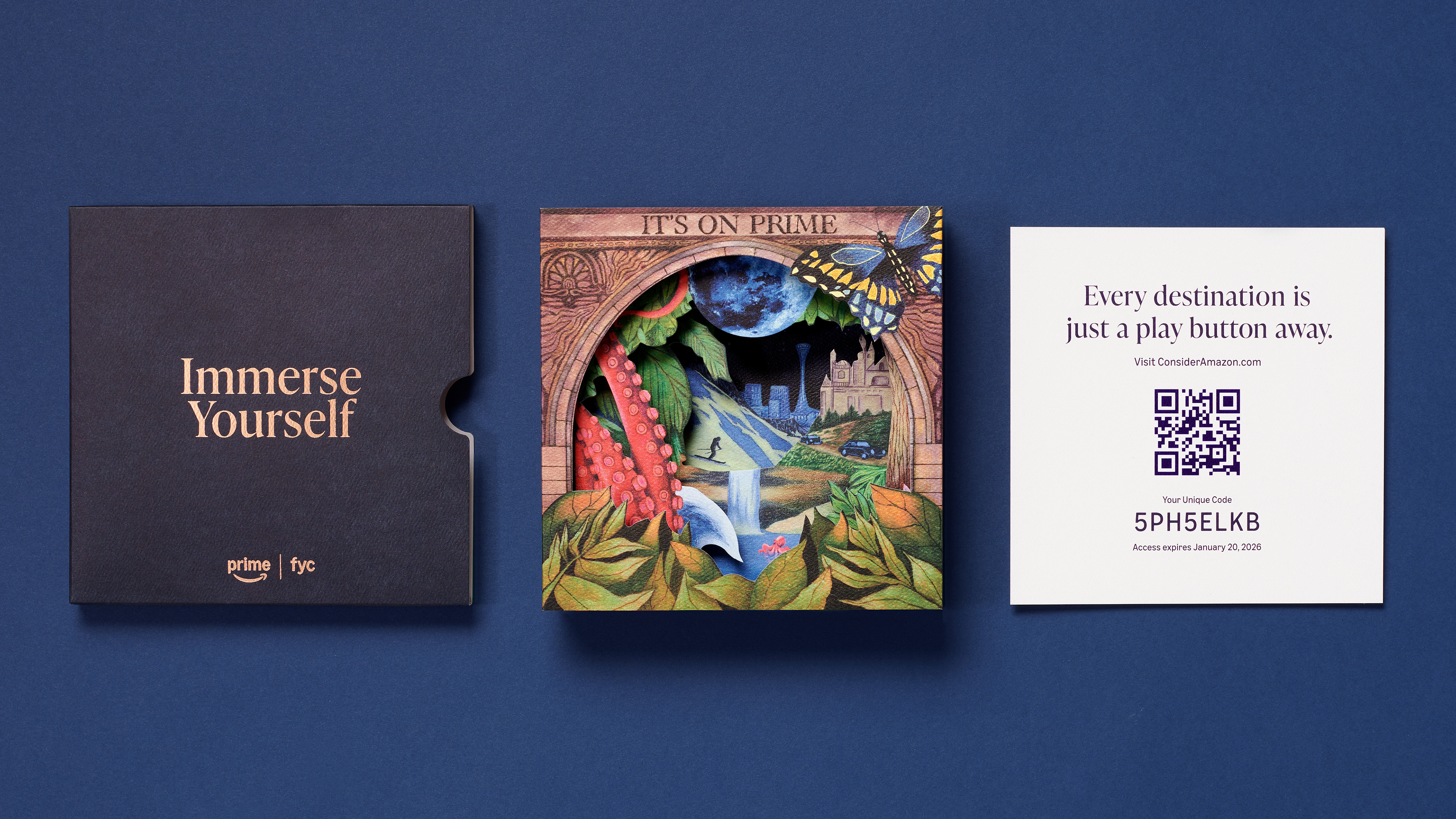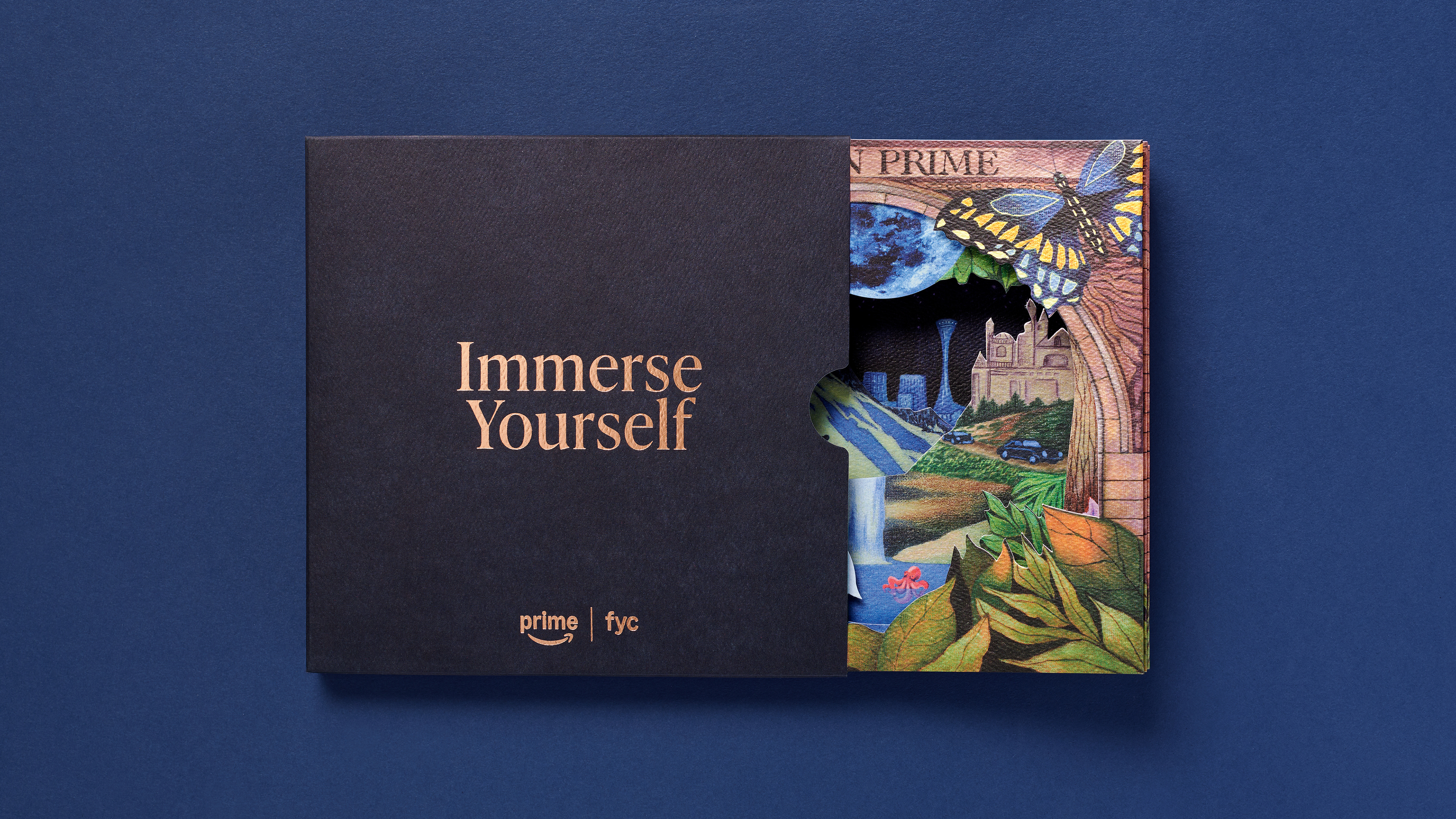An immersive awards-season mailer for Prime Video designed to evoke the breadth of stories available for consideration, inviting recipients to “dive into” the platform’s slate. Role: Creative Director Led the concept, creative direction, and execution, managing creative agency MakeLike and overseeing production of the multi-component package. The dimensional piece unfolds as a layered, tunnel-like structure revealing a series of worlds inspired by Prime Video programming, creating a tactile, exploratory experience that mirrors the act of discovering stories on the platform. Distributed to awards voters and industry influencers, the package was designed to capture attention, communicate scale, and keep Prime Video top of mind throughout the season.